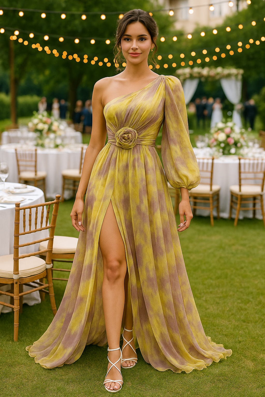 This dress is absolutely stunning! The one-shoulder design and flowy silhouette create such an elegant look, while the soft yellow and lavender hues give it a romantic, ethereal vibe. The floral waist detail and subtle slit add just the right amount of drama, perfect for a summer wedding or formal garden party. Beautifully made and effortlessly flattering.